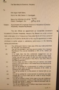 श्री जगन्नाथ बैंस, निवासी मकान नंबर 699, सेक्टर-7, चंडीगढ़, को राजभवन हरियाणा में Comptroller Governor’s Household एवं Director Hospitality के पद पर अनुबंध आधार पर नियुक्त किया गया था। यह नियुक्ति 06.04.2015 की आउटसोर्सिंग पॉलिसी के पैरा (vii) के तहत 01.07.2019 से 30.06.2020 तक थी, या जब तक नियमित नियुक्ति न हो जाए। लेकिन तय अवधि के बाद भी उनकी सेवा लगातार बढ़ाई गई और वे आज तक पद पर बने हुए हैं।